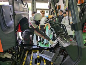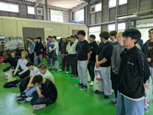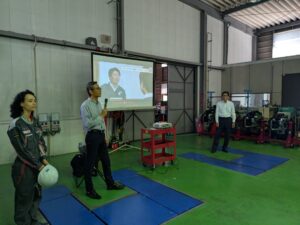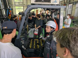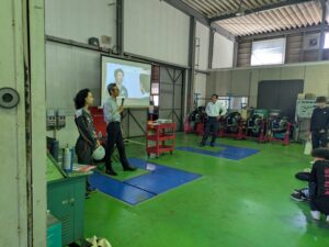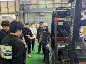 本校卒業生による、フォークリフト、電動リフトについて簡単な整備の実演及び会社概要説明を受けました。